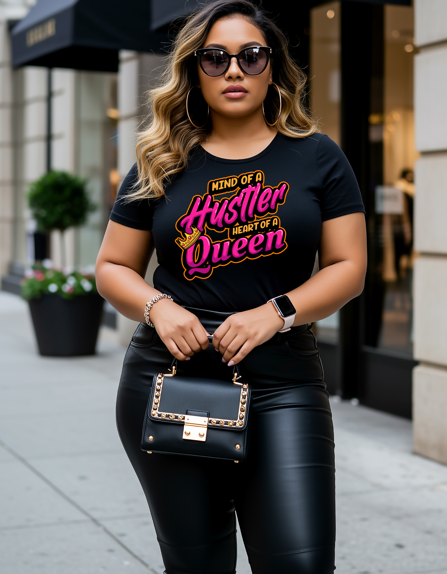 Turn heads with this bold and empowering graphic tee that speaks confidence and hustle. Featuring the vibrant statement “Mind of a Hustler, Heart of a Queen” in striking pink and gold lettering, this shirt is made for women who grind with purpose and lead with grace. The pop of colors and crown detail make it a standout piece for casual outings, boss moves, or everyday motivation.