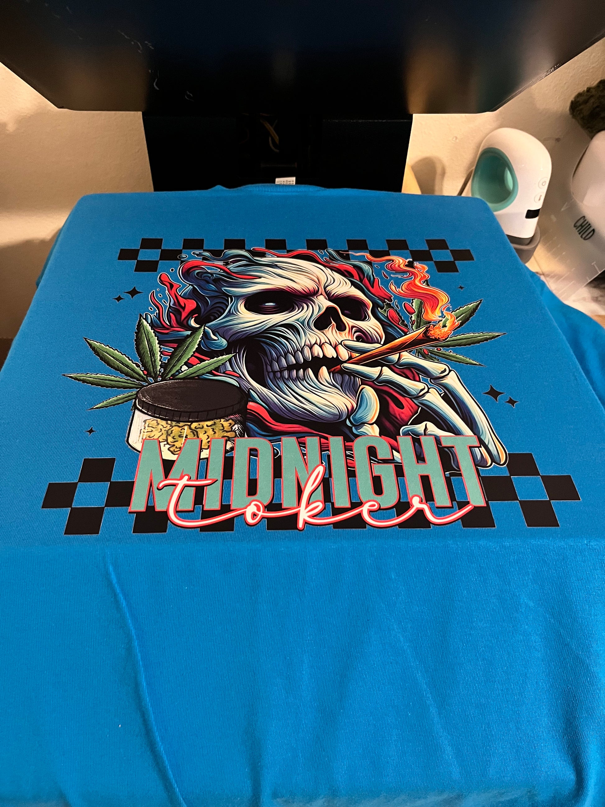 This bold and eye-catching design features a fiery, neon-colored skull with smoke swirling in vibrant shades of blue, red, and orange. The skull is lit with attitude, holding a burning joint between its teeth while surrounded by cannabis leaves for that elevated vibe. At the bottom, the words “Midnight Toker” pop in teal and hot pink, giving it a striking retro-meets-modern feel. Perfect for those who love edgy, late-night energy and unapologetic style.