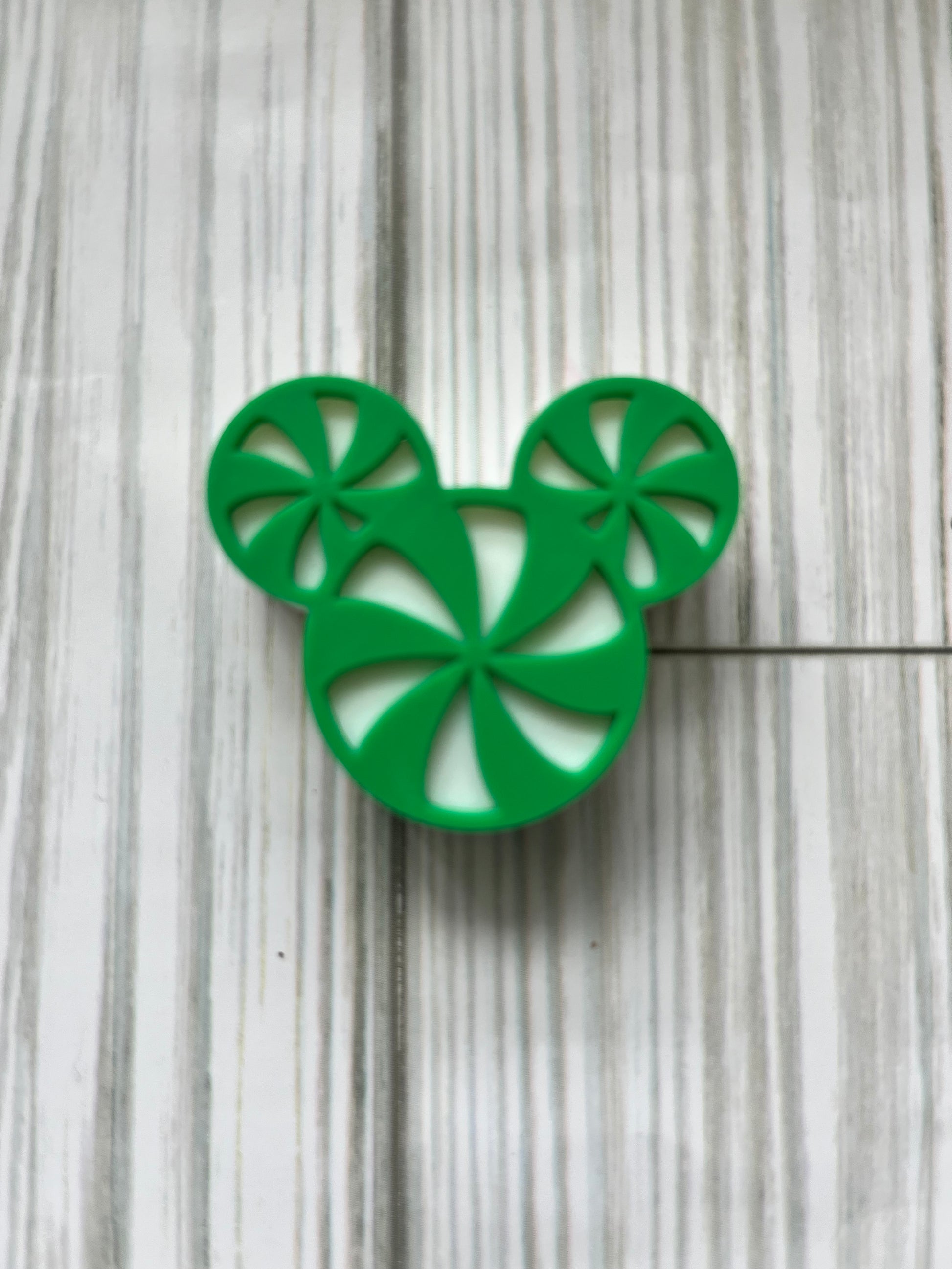 Designed in a playful mouse-ear silhouette, this vibrant green topper features a bold peppermint swirl pattern that gives major holiday vibes. Made from durable, lightweight material, it easily slides onto standard reusable straws for a snug fit. Perfect for Christmas cups, winter-themed tumblers, or anyone who loves cute and eye-catching drink accessories.