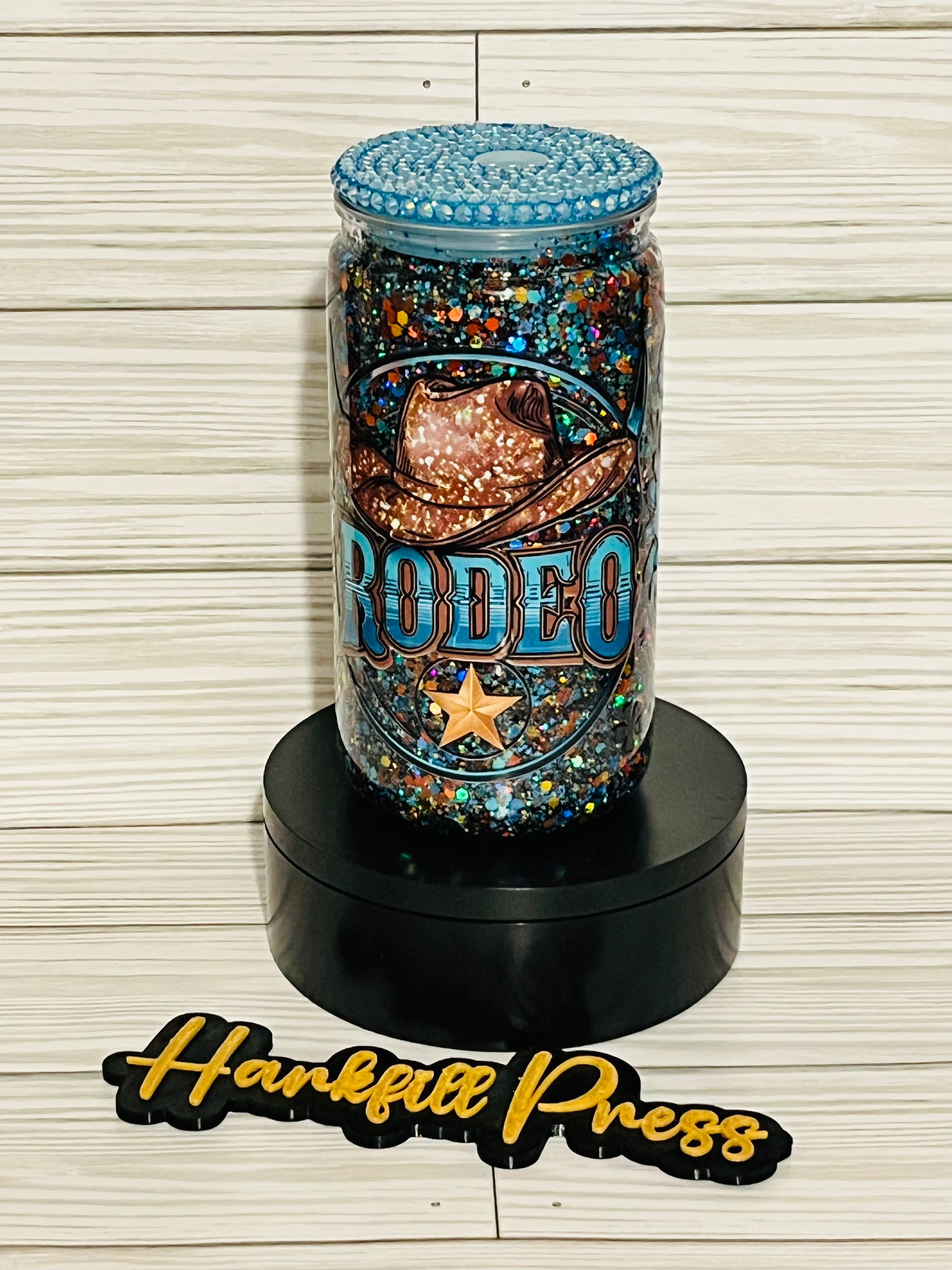 This eye-catching tumbler features a bold cowboy hat and star design with the word RODEO front and center, all set against a dazzling backdrop of chunky, multicolored glitter. The rhinestone-covered blue lid adds the perfect sparkle, making it a true showstopper.