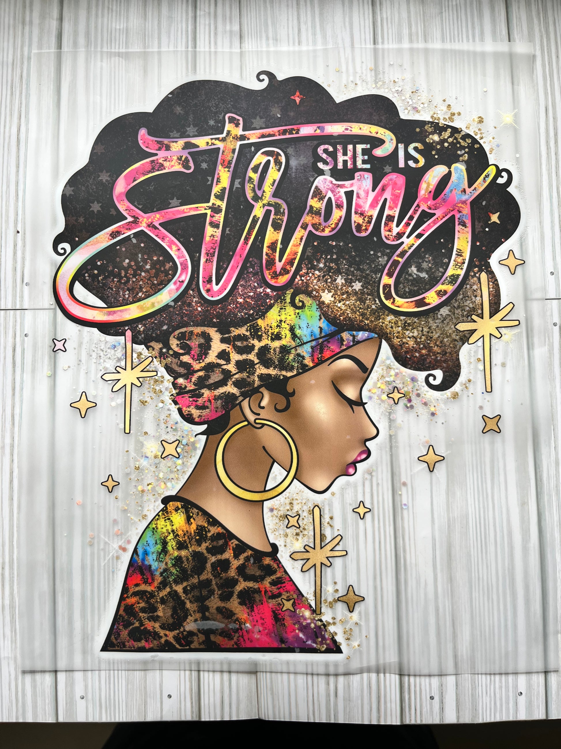 Celebrate strength and beauty with this vibrant “She Is Strong” design. Featuring a stunning woman in profile, adorned with bold gold hoop earrings, a leopard print and multicolor headwrap, and matching top, this image radiates power and grace. The words “She Is Strong” shine in a colorful, glitter-infused script against a backdrop of golden stars and sparkles. This design is a tribute to confidence, resilience, and feminine empowerment.
